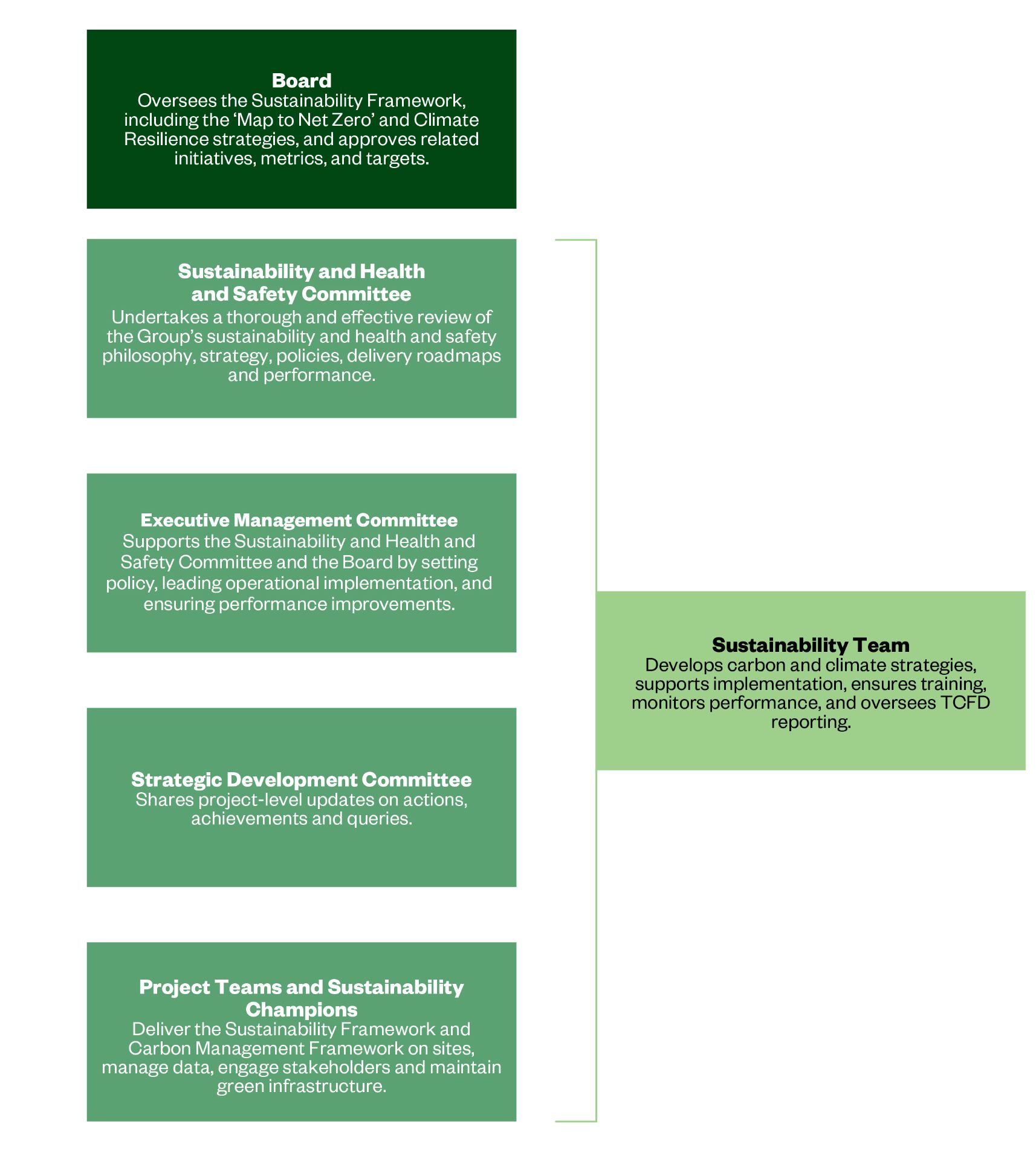 A key step in our Sustainability Framework has been to establish a robust governance structure and define responsibilities across core functions to ensure that there is clear ownership of each element. Accountability for our Sustainability Framework sits with the Board, and is advised by the Sustainability and Health and Safety Committee. The requirements of the Sustainability Framework then flow down through the business, through the Executive Management Committee (EMC) and its members. Reports are submitted to and heard at each Board and EMC meeting . All employees have the opportunity to provide their sustainability ideas and feedback through the Sustainability Champions Group which meets on a quarterly basis comprising representatives from different sites and departments.