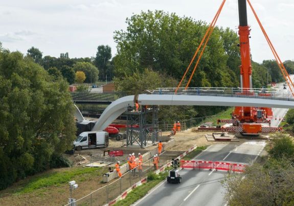 The new pedestrian, cycle and equestrian bridge over the A10 has been installed and finishing works are on track to finalise the predominantly off-road connection from the new Waterbeach development to Cambridge via the upgraded Mere Way early next year.
